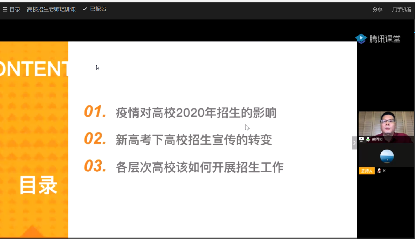 3月24日晚上7:30,邀请熊丙奇博士在腾讯课堂作《高校招生形势分析及疫情影响》专题培训直播,通过政策解读、案例分析,重点介绍了新高考下高校招生宣传的转变、疫情对高校2020年招生的影响,以及各层次院校该如何开展招生工作。永利总站ylzz55经各部门推选有170多名教职工参与在线直播培训。